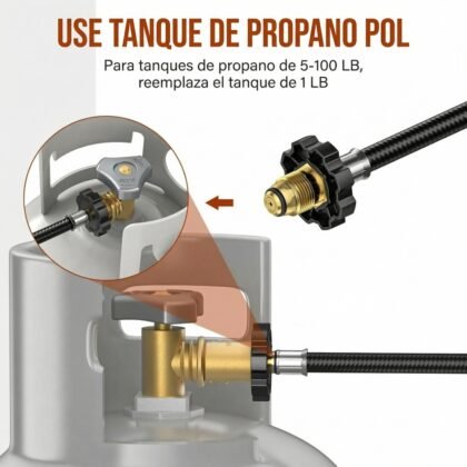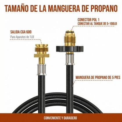 Esta manguera adaptadora de 6 pies (1.8 metros) es la solución definitiva para unificar tu sistema de gas. Conecta fácilmente cualquier equipo diseñado para botellas de 1 lb directamente a un tanque de propano estándar de 10 lbs (o más grande), garantizando horas y horas de uso continuo.