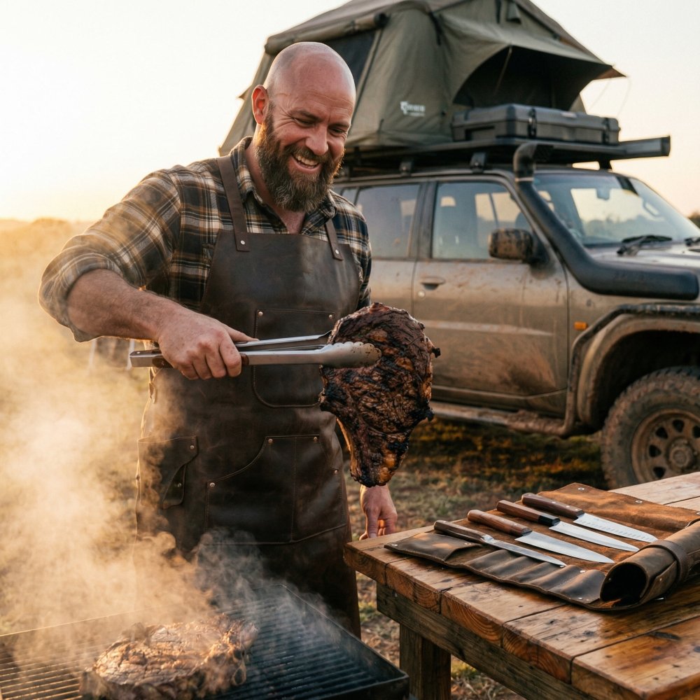 1. El Delantal de Batalla (100% Cuero): No es un simple mandil, es tu armadura contra el calor y las manchas.