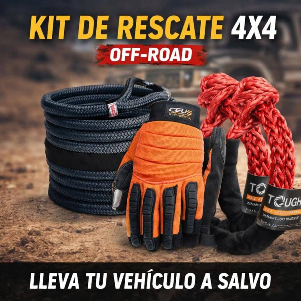 Por qué la recomendamos: A diferencia de las cadenas o cables de acero, las cuerdas kineticas de calidad tienen un porcentaje de elasticidad que absorbe el impacto del “tirón”, protegiendo los chasis de ambos vehículos. Es ligera, fácil de almacenar y esencial para desatascos rápidos en lodo, arena o zanjas.