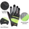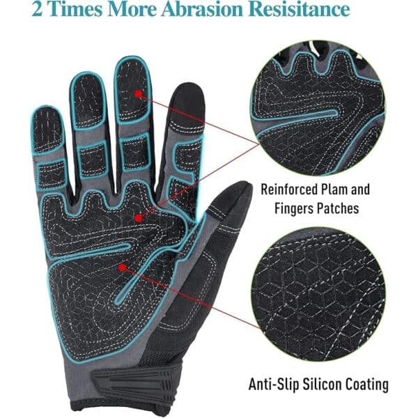 Estos guantes de trabajo, diseñados para la máxima durabilidad y confort, cuentan con palma de cuero sintético reforzado y recubrimiento de silicona que ofrece un agarre excepcional y resistencia a la abrasión nivel 4. La protección de nudillos de TPR cuida tus manos sin limitar la comodidad. Su dorso de spandex y malla, garantiza transpirabilidad y flexibilidad para uso en trocha, mecanica o tareas del dia a dia.