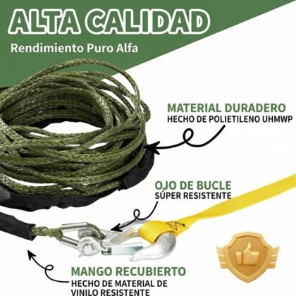 1. Adiós al Metal (Más Seguridad): En caso de una ruptura (algo improbable con su resistencia), la cuerda sintética cae al suelo muerta, sin el efecto látigo letal de un cable de acero cargado con un gancho pesado.