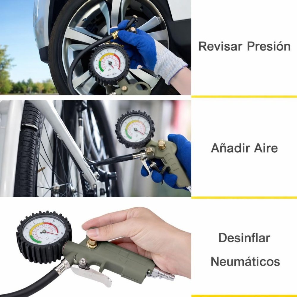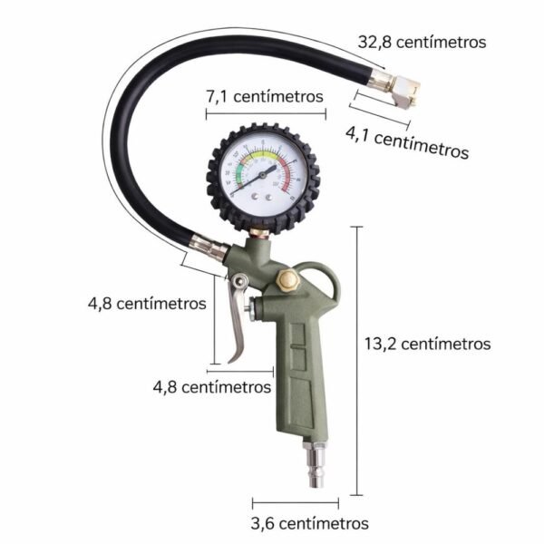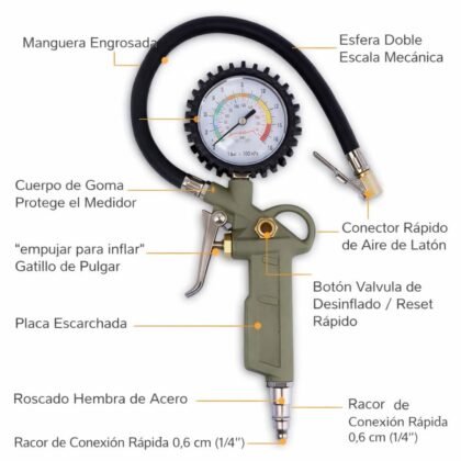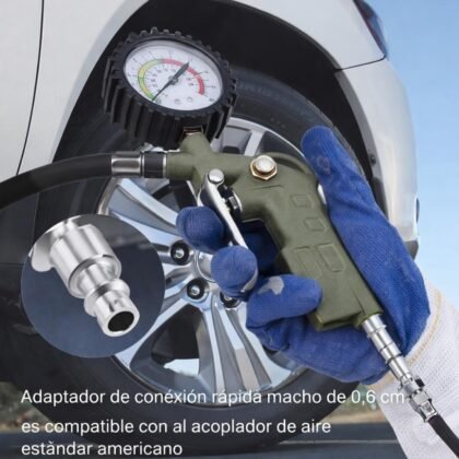 2. Construcción “Heavy Duty”: Olvídate de los accesorios de plástico que se rompen al primer golpe. Este inflador cuenta con una manguera de caucho reforzado y conexiones de latón sólido, diseñadas para resistir la fricción y las altas temperaturas que genera el aire comprimido.