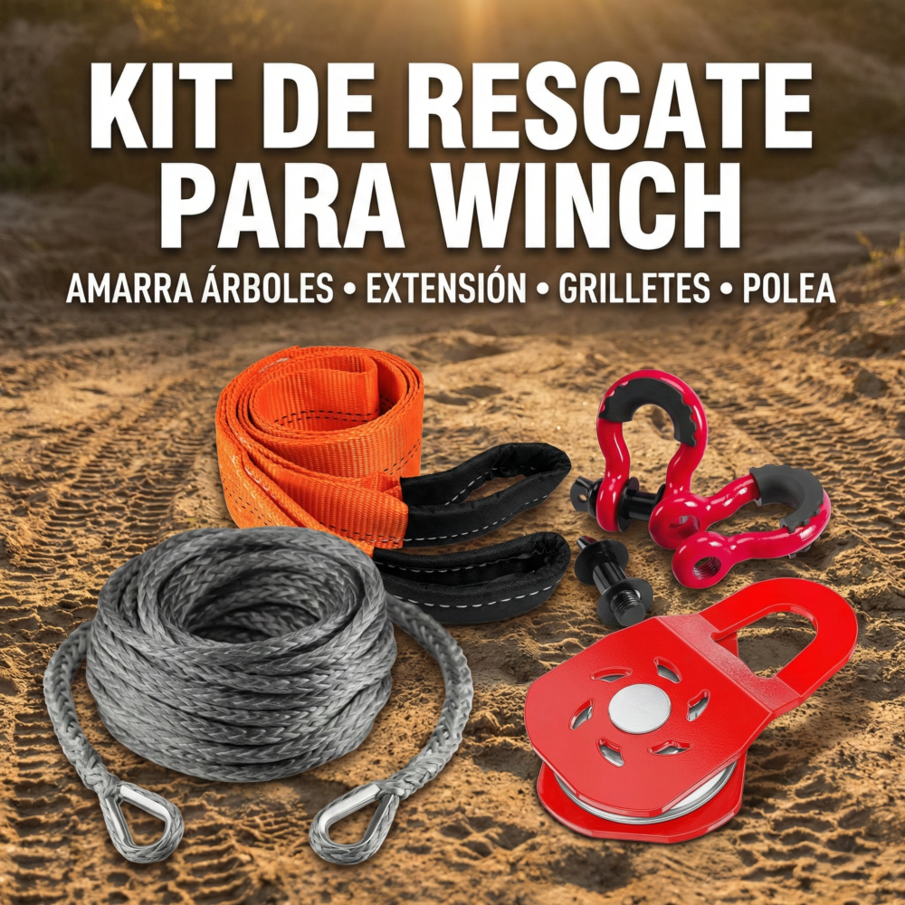 Cuando el camino se pone difícil, tu equipo debe estar a la altura. Este kit esencial reúne los 4 elementos críticos para realizar maniobras de autorrescate y recuperación de vehículos de forma segura y eficiente.