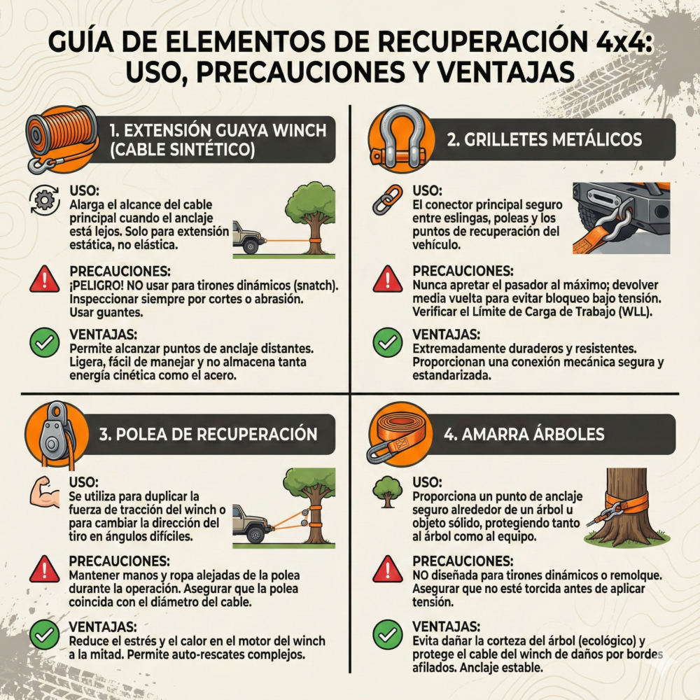 El “Amortiguador” (Winch Damper): Coloca siempre una manta de peso o “damper” sobre la mitad de la línea tensa. Si algo se rompe, el peso ayudará a llevar el cable al suelo, evitando que vuele hacia las personas o vehículos.