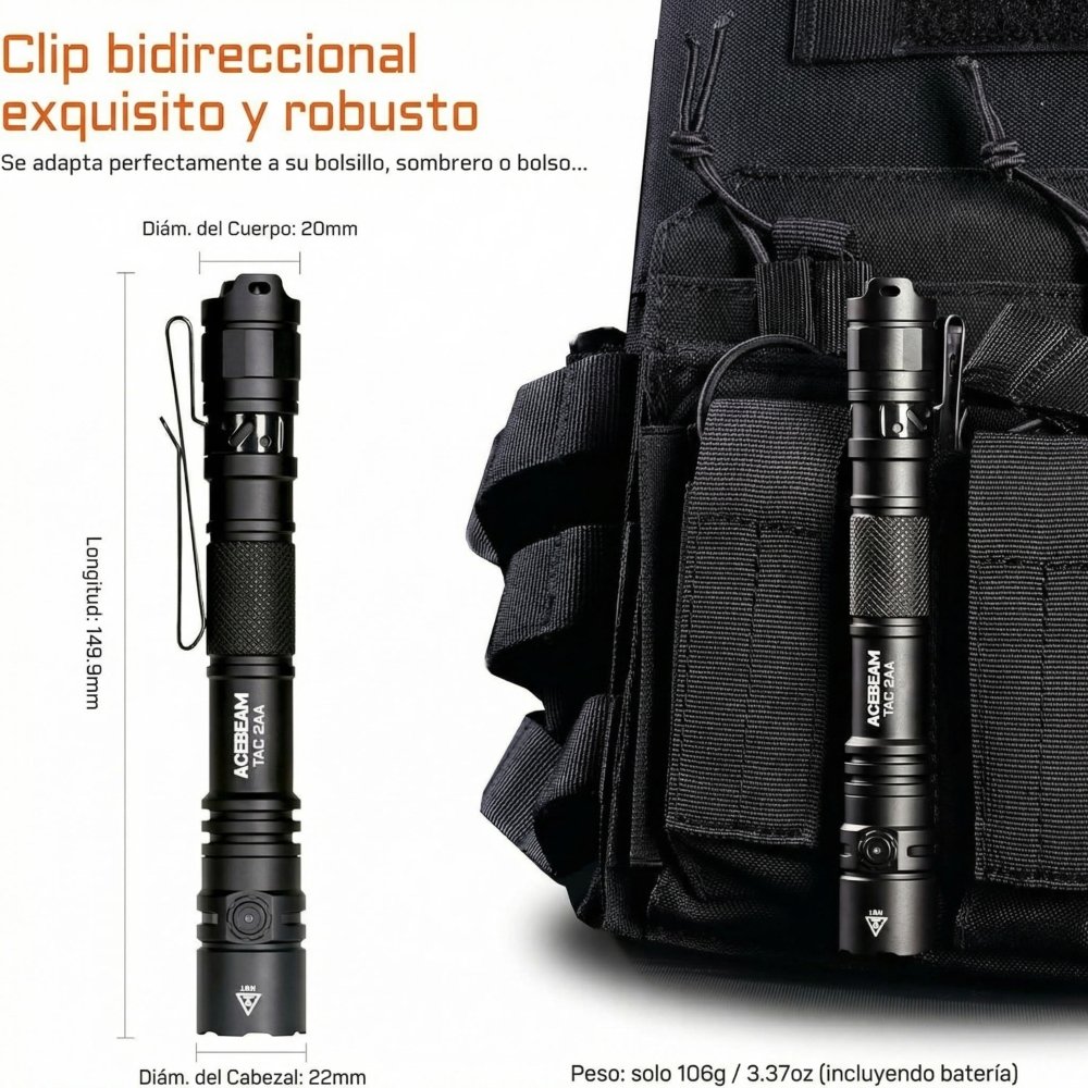 Diseño EDC (Every Day Carry): Incluye un clip de doble dirección de acero inoxidable. Engánchala en tu bolsillo, en tu cinturón o en la visera de tu gorra para usarla como linterna frontal improvisada.