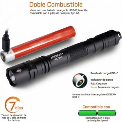 ¿Por qué es esencial para tu kit? Porque es HÃbrida (Dual Fuel). Viene con una baterÃa de alto rendimiento recargable por USB-C, pero si estás en medio de la nada y no tienes dónde cargar, puedes ponerle dos pilas AA alcalinas comunes (las que venden en cualquier tienda de pueblo) y seguir operando. Eso es tranquilidad mental.