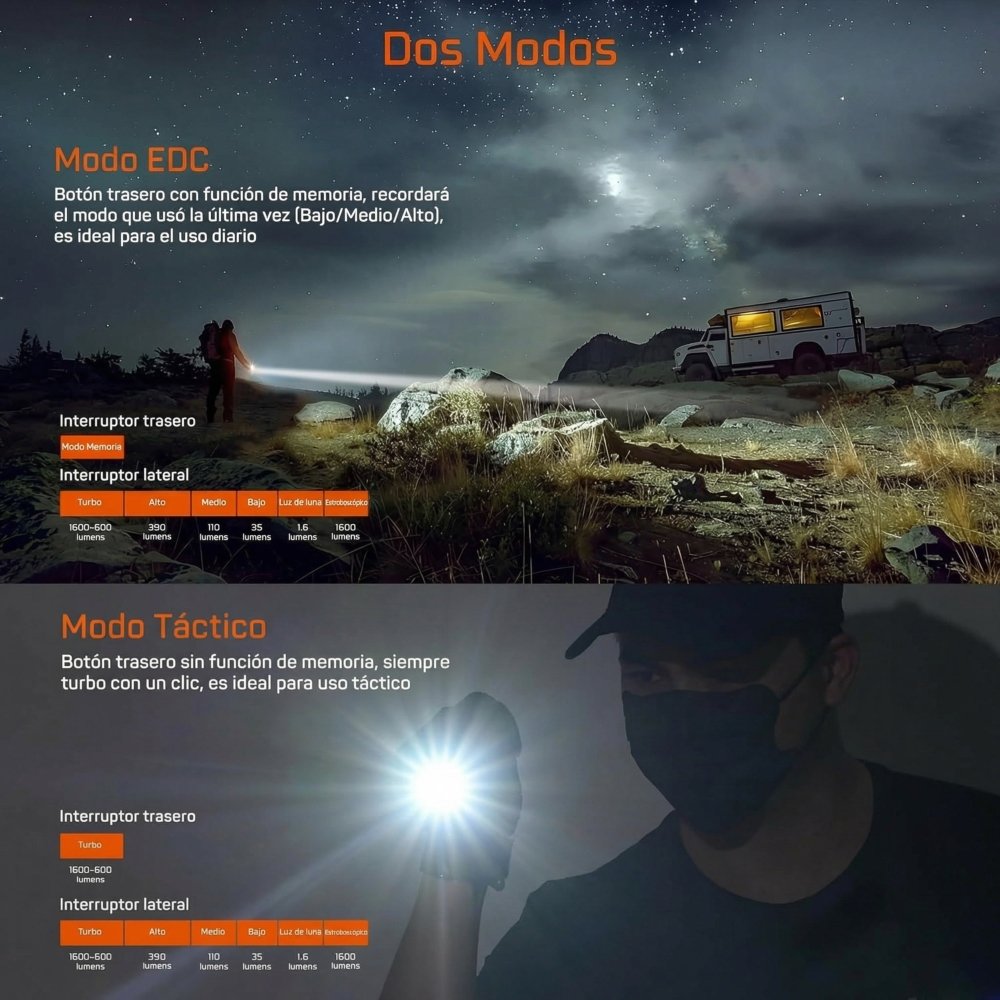 Interfaz Inteligente: Interruptor de cola táctico para encendido momentáneo (presión parcial) o constante. Cambia fácilmente entre sus 4 modos de intensidad + modo Estroboscópico para emergencias.