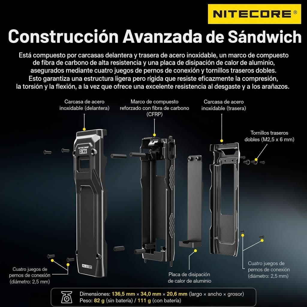 La Nitecore EDC23 no es solo una linterna; es una revolución en el equipo de transporte diario (EDC). Diseñada para romper con el formato cilíndrico tradicional, su cuerpo plano de acero inoxidable con recubrimiento de titanio PVD ofrece una ergonomía superior, permitiendo que desaparezca en tu bolsillo mientras mantiene la potencia de un reflector táctico de tamaño completo.