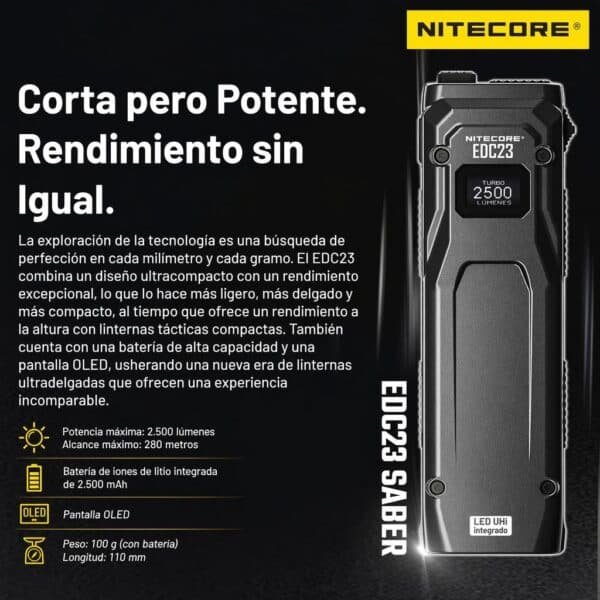 Potencia táctica en tu bolsillo. La Nitecore EDC23 redefine el transporte diario con un perfil ultra delgado y una potencia descomunal de 2500 lúmenes. Equipada con una pantalla OLED en tiempo real, carga rápida USB-C y el innovador sistema de bloqueo Rapid Lock™, es la herramienta definitiva para quienes buscan rendimiento profesional sin el volumen de una linterna convencional. Ligera, plana y lista para la acción. Encuéntrala en Urso Outdoors.