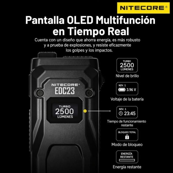 Control Total con Pantalla OLED Olvídate de adivinar cuánta batería te queda. Su pantalla OLED integrada te muestra en tiempo real el nivel de lúmenes, el voltaje de la batería y el tiempo de ejecución restante. Además, su interruptor Rapid Lock™ permite un bloqueo parcial (para evitar encendidos accidentales pero manteniendo acceso al Turbo/Strobe) o un bloqueo total para máxima seguridad en tu morral.
