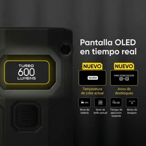 Deja de adivinar cuánta batería te queda. Su pantalla OLED integrada te muestra en tiempo real: