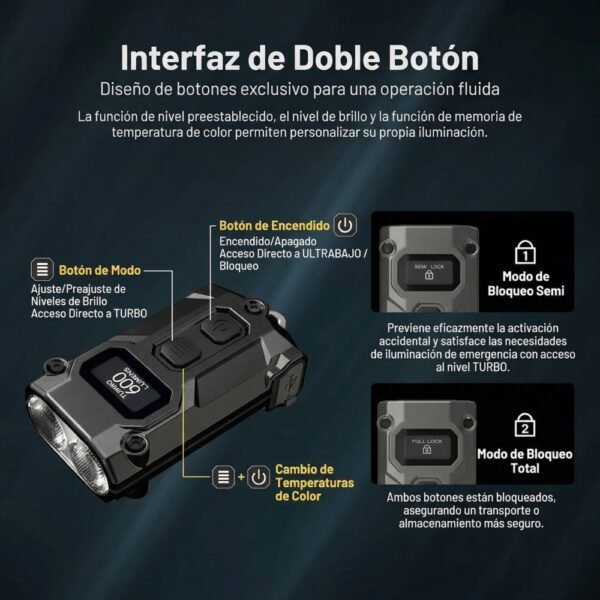 Doble Bloqueo: Modo de bloqueo 1 (Semi) para acceso rápido al Turbo, y Modo 2 (Full) para que nunca se encienda accidentalmente en tu bolsillo o mochila.