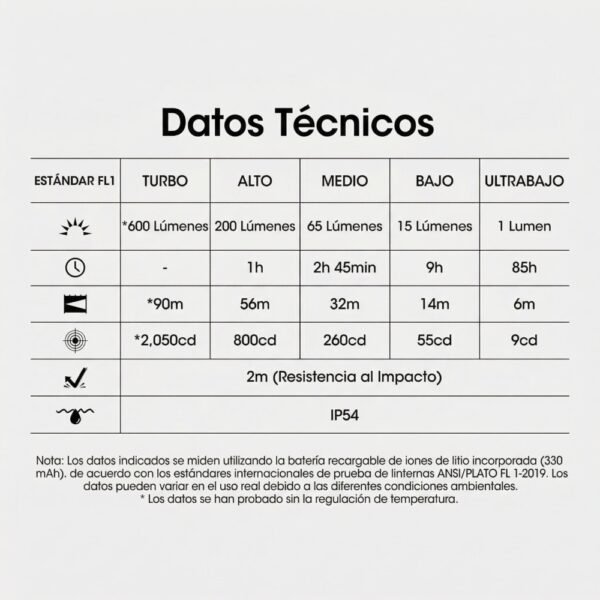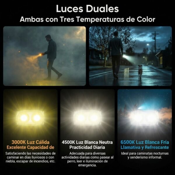 6500K (Fría): Máxima potencia y contraste. Úsala para “romper” la oscuridad y buscar objetos a distancia (hasta 90 metros).