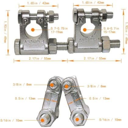 Claramente etiquetados con terminales positivos y negativos, estos terminales son ampliamente utilizados en aplicaciones automotrices, marinas, vehículos recreativos, campers y más. Su versatilidad los convierte en la solución ideal para una variedad de necesidades de conexión de baterías.